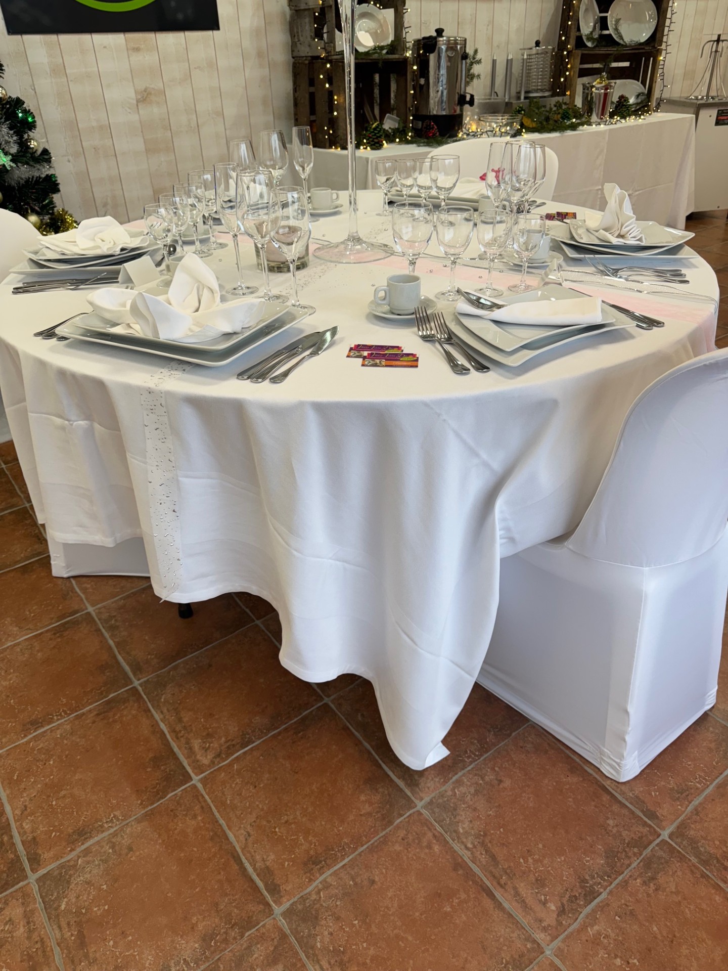 Grande nappe tissu blanc (240×240 cm), conçue pour nos tables de 180 cm de diamètre. Assure une retombée de gala. Service disponible pour retrait ou livraison autour de **Rougé, Cesson-Sévigné et Saint-Nicolas-de-Redon**