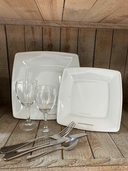 Montez en gamme avec notre Kit FESTIVITÉS : il inclut **1 Grande Assiette Carrée 25x25cm, 1 Petite Assiette Carrée 23x23cm, 1 Couteau/1 Fourchette/1 Petite Cuillère PRESTIGE, 1 Verre Élégance 14cl et 1 Verre Élégance 19cl**. Parfait pour les événements chics, modernes ou les tables d’honneur.