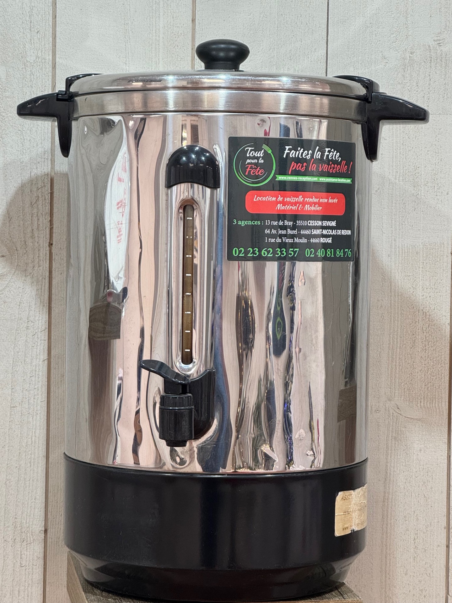 Machine à café professionnelle de grande capacité (15L / 100 tasses). Idéale pour les séminaires et petits déjeuners. **À rendre propre après utilisation.
